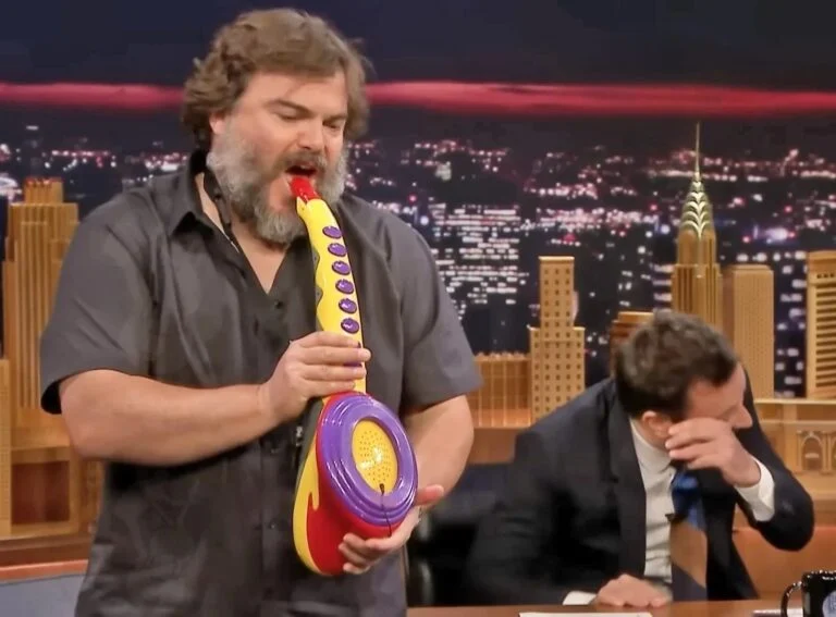 Jack Black’s Sax-A-Boom Performance on The Tonight Show Starring Jimmy FallonJack Black’s appearance on The Tonight Show Starring Jimmy Fallon, where he played his iconic Sax-A-Boom, is one of the show’s most memorable moments. Known for incorporating the children’s toy into his live performances, Black humorously insisted that the Sax-A-Boom is a unique instrument that requires years of practice to master.When Fallon produced a Sax-A-Boom on set, Black treated it with the reverence of a rare Stradivarius violin, promising the audience a “taste” of his skills. The performance that followed was a comedic masterpiece, with Black energetically playing the toy saxophone, which emitted pre-recorded melodies at the press of buttons. His exaggerated expressions and dance moves added to the hilarity, captivating the audience and earning their enthusiastic applause.The fun didn’t stop there. Black approached The Roots, the house band, and their leader Questlove led them into a funky rhythm. Black and Fallon joined in with their dance moves, turning the segment into a standout moment on The Tonight Show. This performance has since become a viral sensation, amassing 95 million views on YouTube, and is ranked as the seventh most popular video on the show’s channel.Watch the video below to experience Jack Black’s unforgettable Sax-A-Boom performance on The Tonight Show Starring Jimmy Fallon.