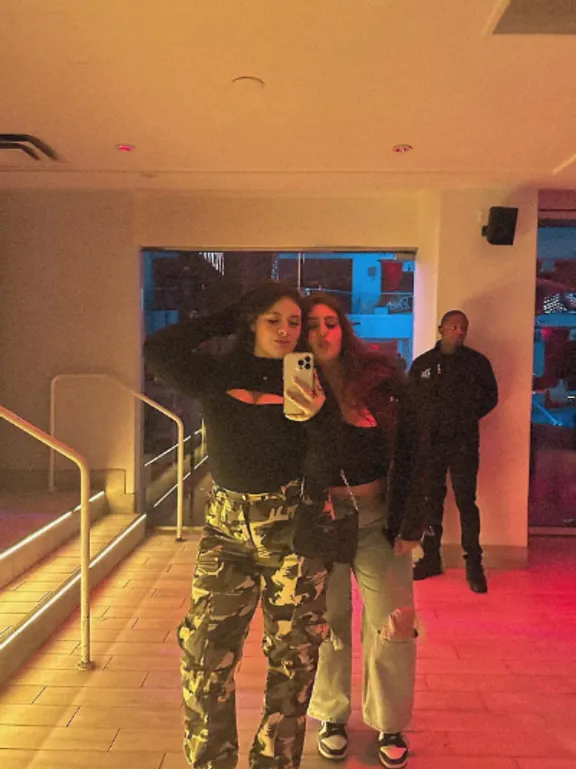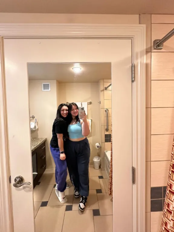 A screenshot of Olivia Pacino with company during her weekend getaway | Source: Instagram/oliviapacinoAmong the pics was a bathroom selfie with a female friend revealing Olivia in a light blue crop top and navy bottoms, contrasting her friend’s black T-shirt and blue pants.
