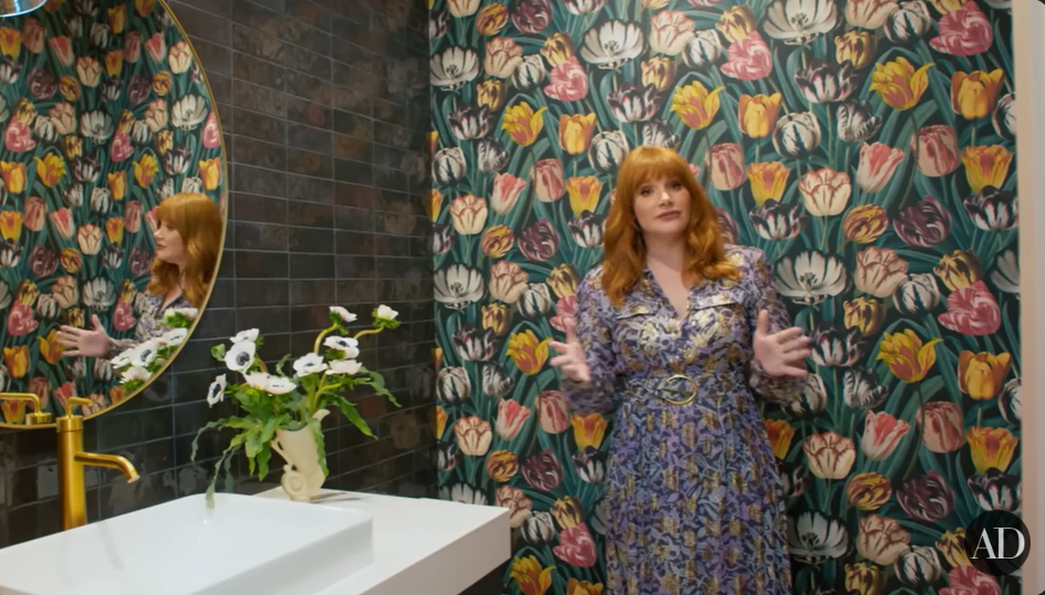 Howard and Gabel’s love for “Star Trek: The Next Generation” and its retro-futuristic aesthetic found its way into their primary bedroom. The room, with its curving lines, flea market treasures, and a muted dusty rose palette, has a touch of ’80s nostalgia. Howard fondly recalls her childhood dream of living on the Starship Enterprise, drawn to the gentle futurism of Gene Roddenberry’s world.The house is also filled with sentimental touches that reflect their journey together. A small canvas, a gift from Thomas to Howard on her 40th birthday, is embroidered with the nicknames their children have for them. As Howard puts it, it’s a “jewel box and a sandbox all in one,” a place where memories are treasured and new stories are created daily.Tulips, a reminder of the summer Howard and Gabel fell in love in Amsterdam, adorn the walls of the guest bathroom. The couple have a love story that is timeless and beautiful. Howard’s feelings for Gabel were immediate and intense. The moment she laid eyes on him on the New York University campus, she was smitten.Bryce Dallas Howard's guest bedroom in her Los Angeles home from a video dated June 7, 2022 | Source: youtube.com/@Archdigest