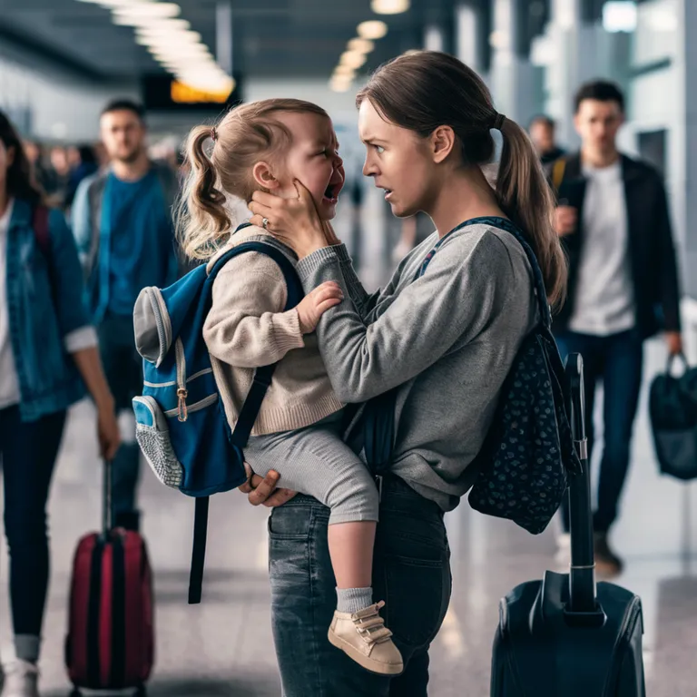 A distraught woman standing at the airport with her crying baby | Source: Midjourney