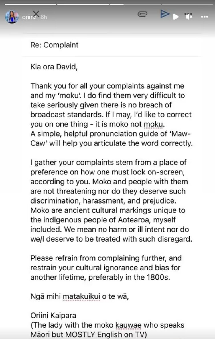 Credit: Oriini Kaipara / Instagram.Kaipara also shared her email response to David, where she wrote that she was unable to take his complaint seriously “given there is no breach of broadcast standards.”She also made a point of correcting his spelling of moko, as David had referred to hers as “moku”.In her email, Kaipara continued: “I gather your complaints stem from a place of preference on how one must look on-screen according to you. Moko and people with them are not threatening nor do they deserve such discrimination, harassment and prejudice.“We mean no harm or ill intent nor do we/I deserve to be treated with such disregard,” she continued. “Please refrain from complaining further, and restrain your cultural ignorance and bias for another lifetime, preferably in the 1800s.”