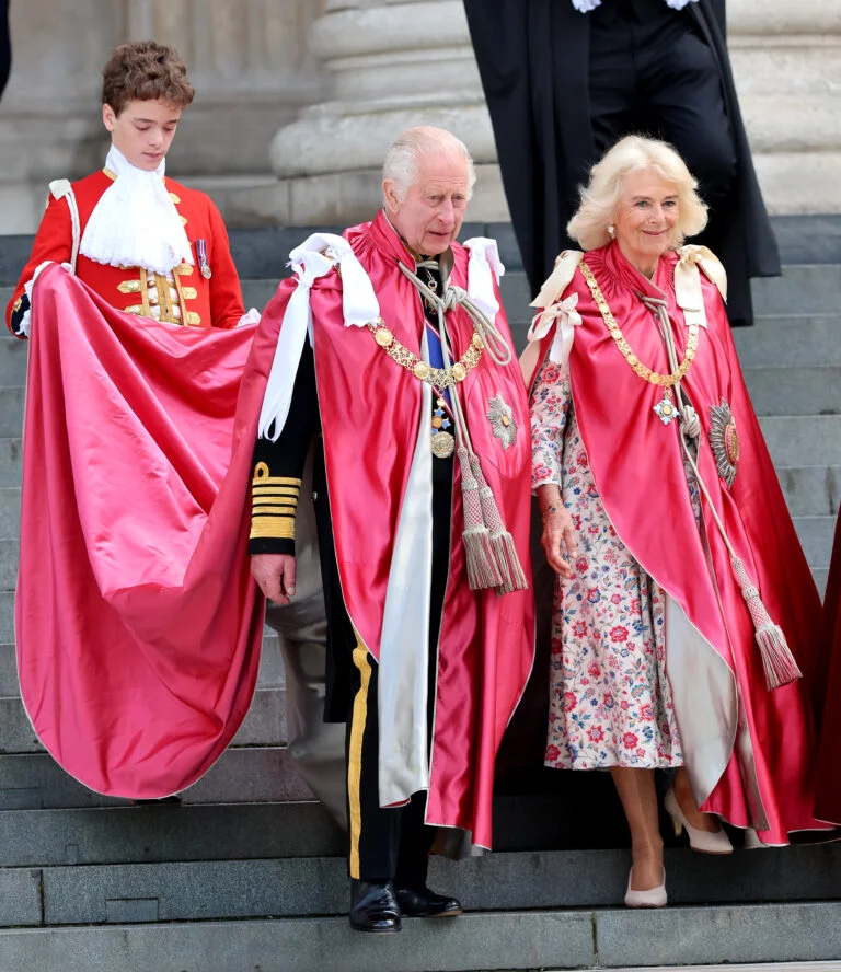 LONDON, ENGLAND – MAY 15: King Charles III and Queen Camilla walk down the steps of St Paul’s Cathedral as they depart a service of dedication for the Order of The British Empire at St Paul’s Cathedral on May 15, 2024 in London, England. King Charles III is the Sovereign of the Order of the British Empire and Queen Camilla is the Grand Master of the Order of the British Empire. (Photo by Chris Jackson/Getty Images)
